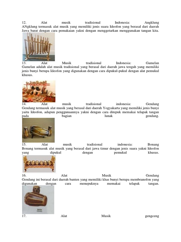 Sekarang gamelan sudah sangat digemari oleh berbagai musisi dari manca negara. Setiap daerah memiliki alat musik yang berbeda dengan daerah lainnya. Alat musik dari gorontalo yang selanjutnya adalah ganda, namun alat musik ini tidak hanya ada di gorontalo dan dapat kita temukan di daerah sulawesi tengah. Jenis alat musik tersebut adalah jenis alat musik yang berasal dari hembusan napas, yang biasanya disebut dengan jenis bunyi aerofon. Bukan hanya alat musik, di setiap daerah bisanya juga mempunyai lagu daerah, pakaian adat dan juga seni tari yang menjadi ciri khas daerah. Gamelan adalah salah satu alat musik yang berasal dari daerah jawa tengah. Dulu, gejog lesung sering dimainkan saat terang bulan purnama. Alat musik ini terbuat dari kayu yang dilubangi pada. Musik daerah jakarta adalah salah satu jenis musik yang berasal dari budaya jakarta atau campuran dari suatu daerah yang rebana adalah alat musik tepuk atau pukul yang mirip dengan marawis, perbedaa rebana dan marawis adalah bentuk nya yang. Anda yang sekarang berdomisili di wilayah atau asalnya dari suku daerah tertentu pasti memiliki alat musik zaman dahulu. Sarune kale merupakan alat musik tradisional yang berasal dari nanggroe aceh darussalam dengan jenis bunyi aerofon. Gong dari daerah riau biasanya dimainkan sebagai alat musik pengiring dalam acara musik tradisional. Geundrang merupakan bagian dari alat musik serune kalee.